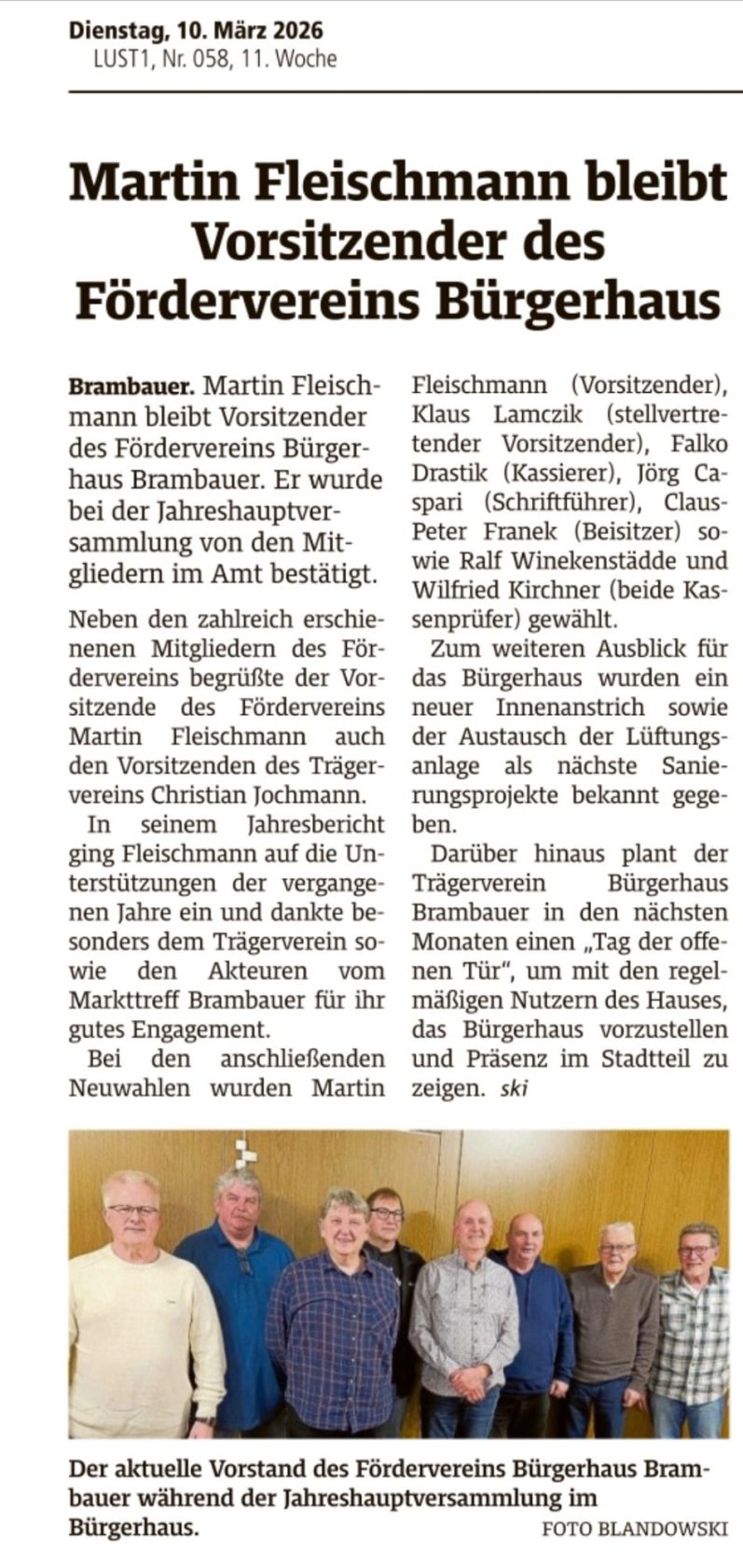 Der Förderverein Bürgerhaus Brambauer e.V. ist gegründet worden, um den Erhalt und Weiterbetrieb des Bürgerhauses Brambauer für alle interessierten Bürgerinnen und Bürger, Gruppen und Vereine zu unterstützen. Er verfolgt ausschließlich und unmittelbar gemeinnützige Zwecke im Sinne des Abschnitts "steuerbegünstigte Zwecke" der Abgabenordnung.